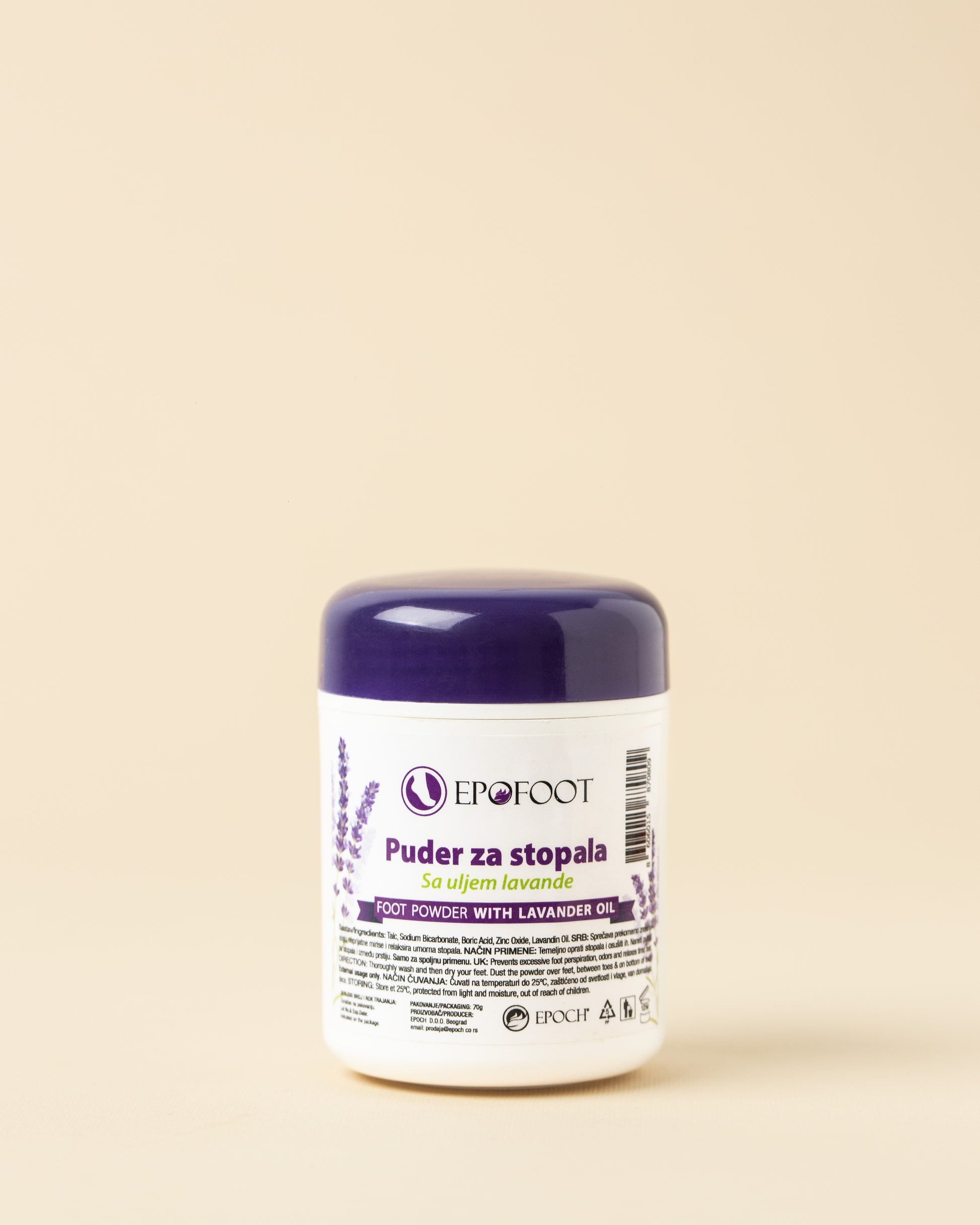 Puder za stopala na bazi talka, sode bikarbone, borne kiseline, cinka i ulja lavande.
